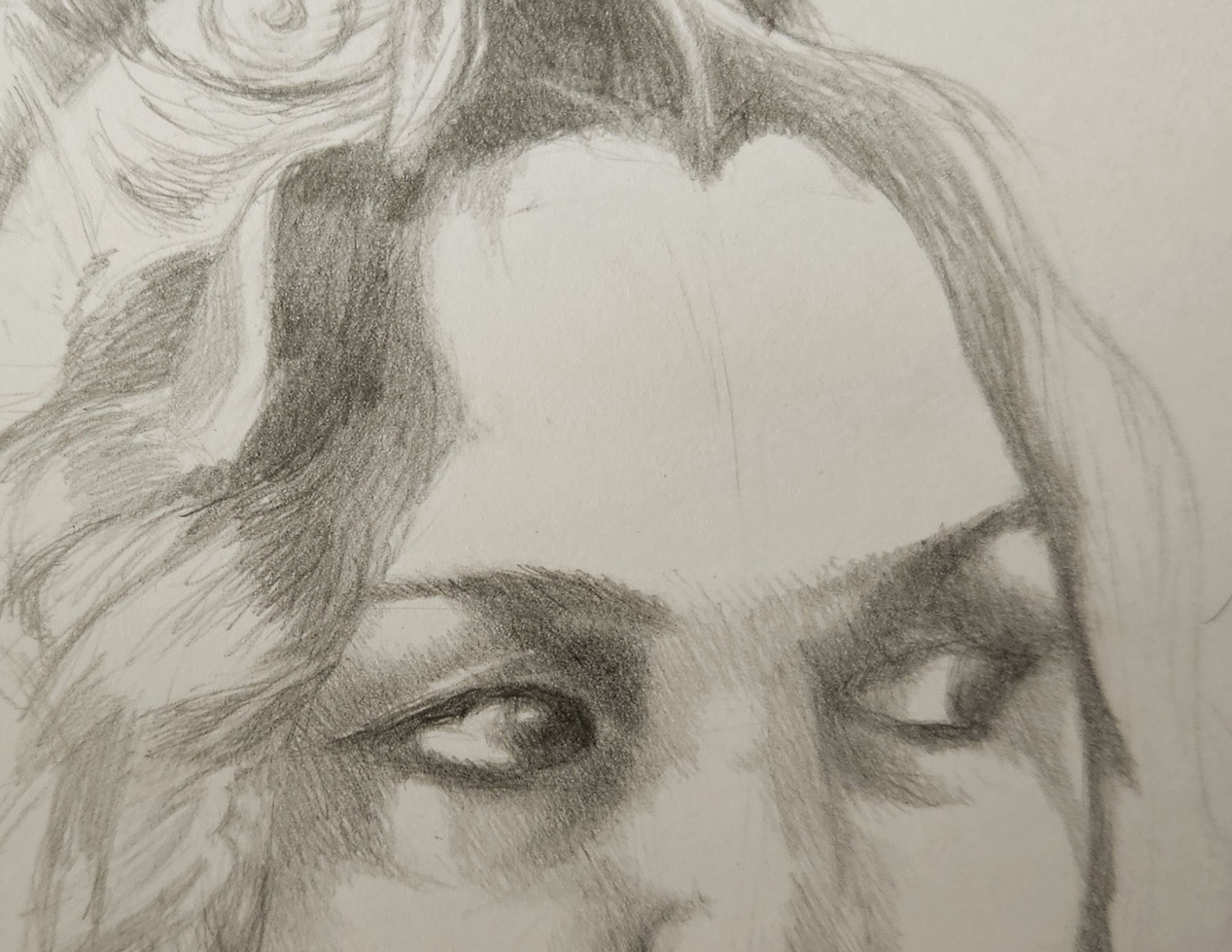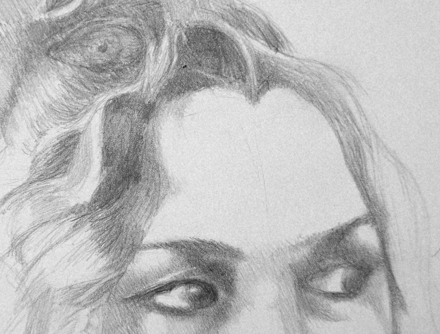 Gisterenavond ook fijn papier gestreeld. Ik noem het zo omdat ik op dik, ‘technisch tekenpapier’ werk waar bijna geen korrel in zit dus met een glad oppervlak. Zeker voor de lichte toetsen, vergt dat ‘fingerspitzengefühl’… het moet gestreeld worden en soms voelt het zelfs alsof ik over het papier zweef. De bijzondere dame uit de bus vordert. Ze krijgt mooie krullen, al zeg ik het zelf. Het punt van loslaten nadert maar er mist nog iets… en hopelijk kom ik er vanavond achter wat precies. Tis een kwestie van doorzetten en vooral… geduld!