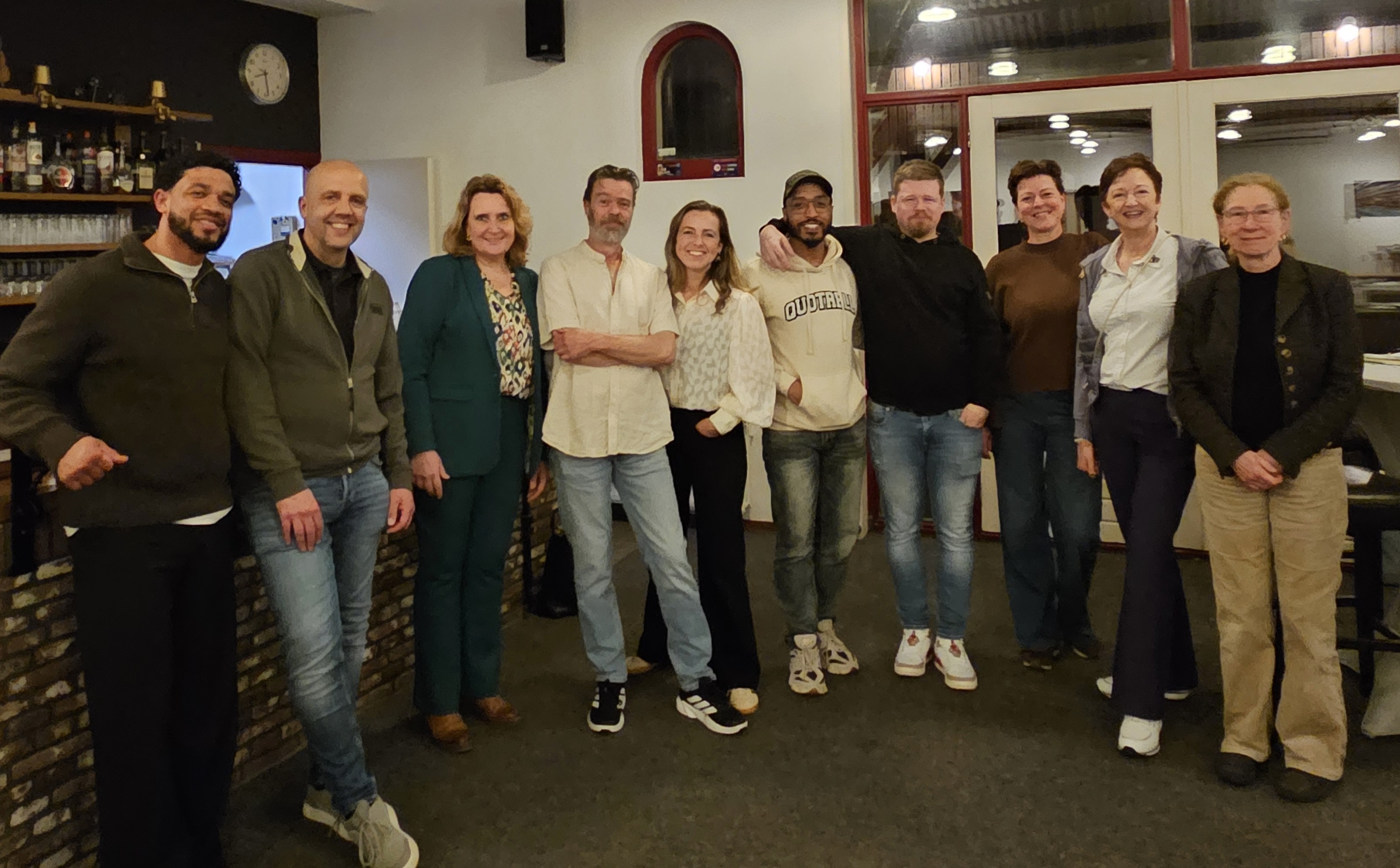 Na het serieuze werk, kon ik het niet laten om een klein beetje reclame te maken. Voor mezelf maar ook voor de komende duo-expo in de Cultuurhoek. De ruimte van Champ 'Aubert was tevens een expositiezaal dus een bruggetje was snel geslagen, en een praatje snel gemaakt, terwijl ik visitekaartjes uitdeelde en erachter kwam bij wie ik moest zijn om daar te exposeren. Voor deze blog werd er zelfs nog een groepsfoto gemaakt met leden van de Rotary en het Sociale Dorpsteam, en zo eindigde een mooie, bijzondere avond.