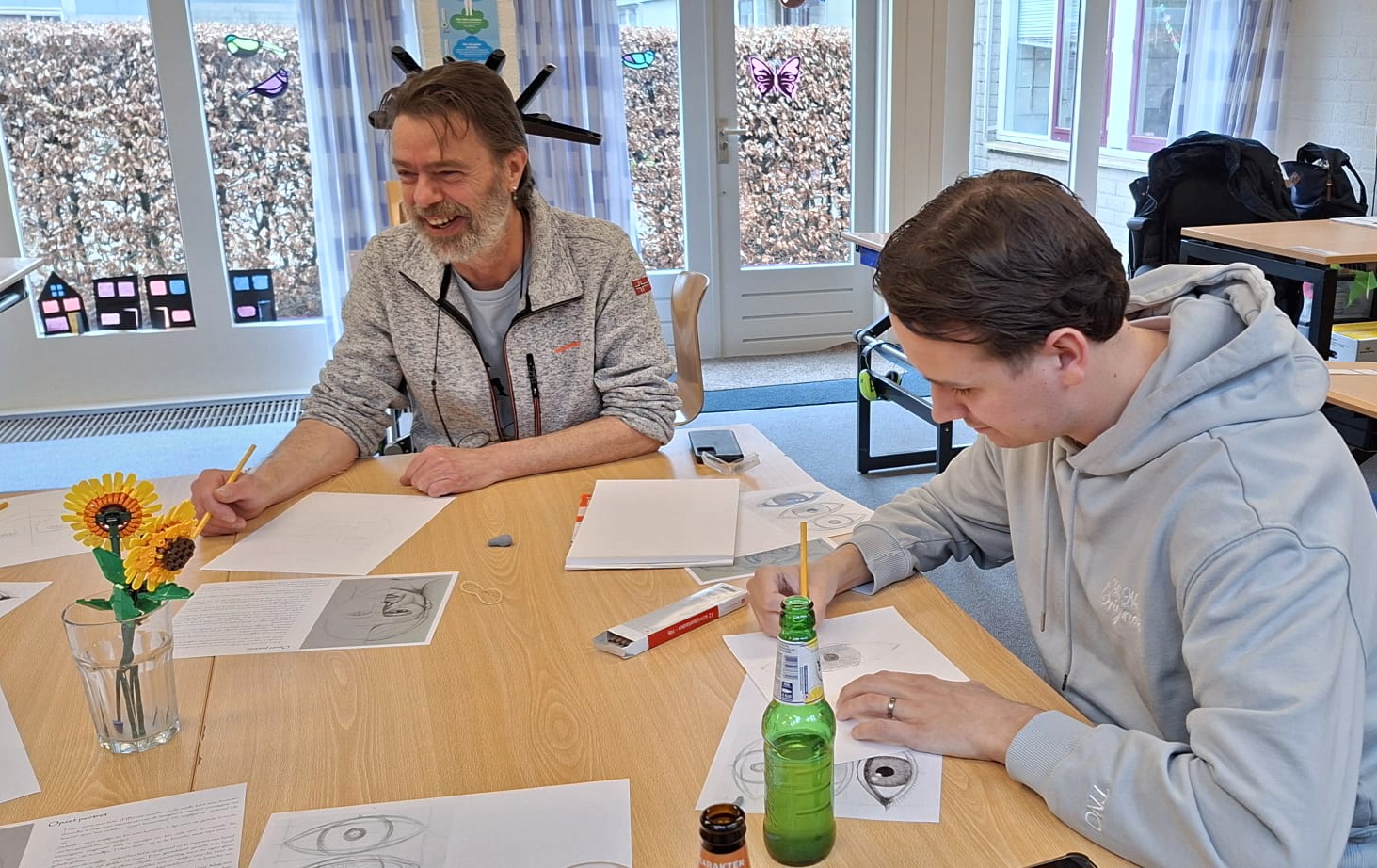 De werkweek werd creatief afgesloten. Aan het eind van een inspirerende studiedag voor leerkrachten, mocht ik een workshop geven in portretteren aan vier collega’s. Mijn zoon was al geslaagd voor zijn eerste les dus ik had goede hoop... maar ze bleken er toch meer moeite mee te hebben dan mijn zoon… zou het dan toch in de genen zitten? Zelf tekende ik gezellig mee zodat ze ook konden meekijken hoe ik het deed met mijn eigen lesmethode en uiteindelijk kregen ze toch iets aardigs op papier na een gezellig uurtje met een borrel en gezellige muziek op de achtergrond. Lovely jobly!